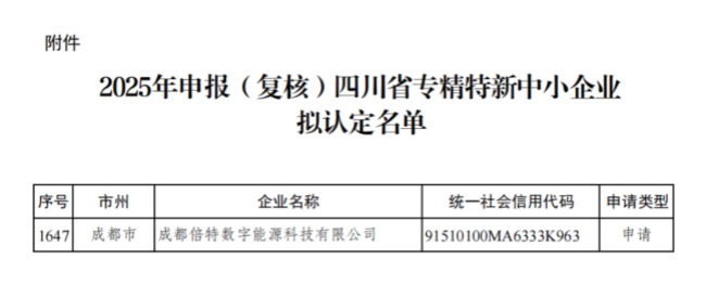 302025-09 倍特?cái)?shù)能獲四川省專精特新中小企業(yè)認(rèn)定近日,四川省經(jīng)濟(jì)和信息化廳公示2025年申報(bào)(復(fù)核)四川省專精特新中小企業(yè)擬認(rèn)定名單,高新發(fā)展下屬成都倍特?cái)?shù)字能源科技有限公司(以下簡(jiǎn)稱倍特?cái)?shù)能)憑借其在數(shù)字能源領(lǐng)域的創(chuàng)新實(shí)力成功入選。這一認(rèn)定是對(duì)企業(yè)專業(yè)化、精細(xì)化、特色化、新穎化發(fā)展路徑的充分肯定,標(biāo)志著倍特?cái)?shù)能在技術(shù)創(chuàng)新與發(fā)展質(zhì)量方面邁上新的臺(tái)階。瀏覽 : 874分享